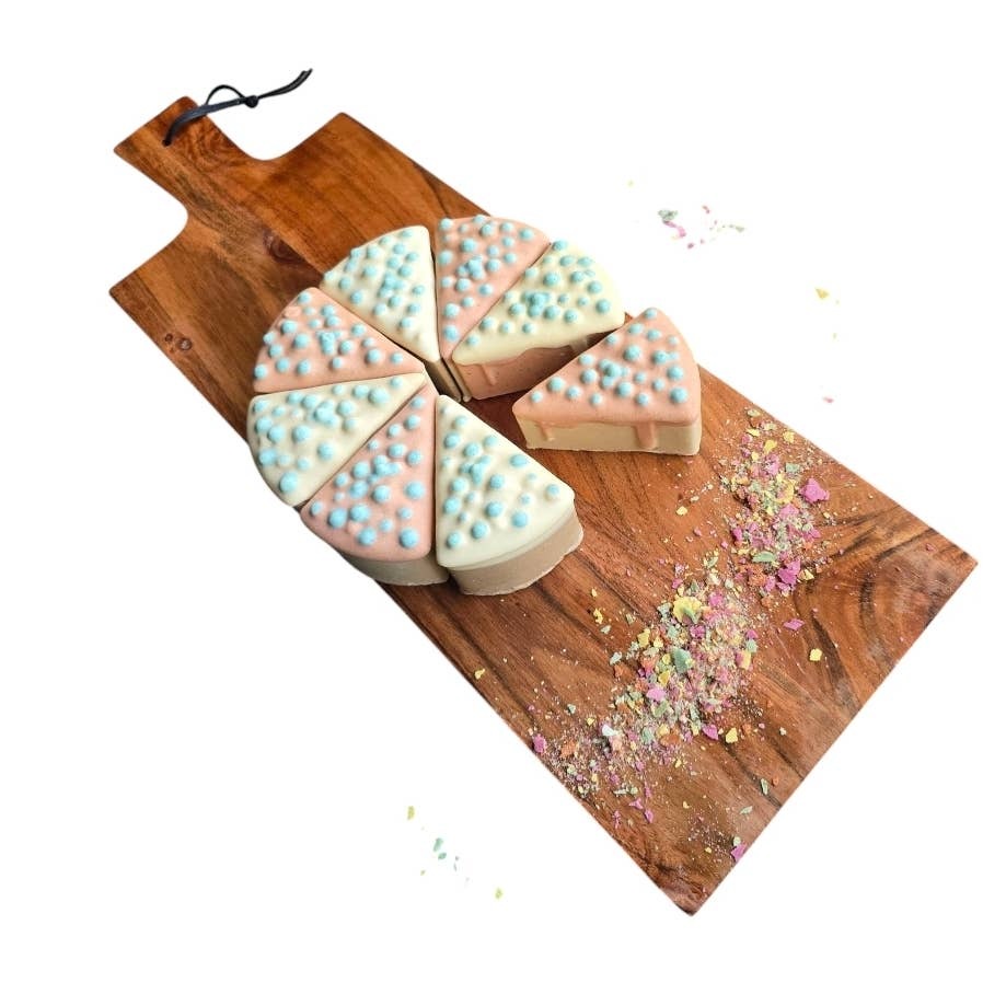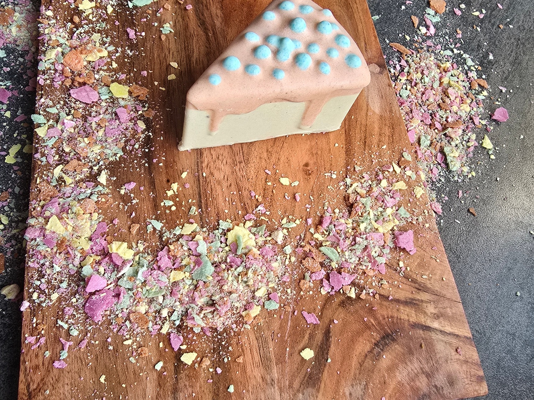 Een gevulde BlueberryCheeseCake in een taartverpakking Uit een gezonde mix van plantaardige vetten, dierlijke oliën & meel - gecombineerd met natuurlijke kleurstoffen zoals rode biet, zwarte boon, zalmolie, etc.